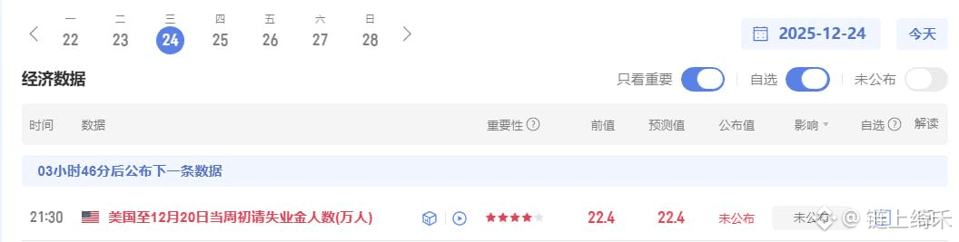 重点来了!图一的经济日历显示,今晚21:30,美国初请失业金数据公布。 前值和预测都是22.4万人。