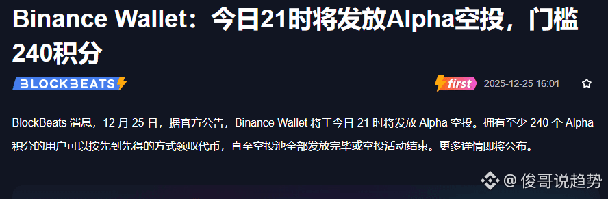 嘿,各位币圈的小伙伴们,我是俊哥,今天咱就来聊聊Binance Wallet这次将在今日21时发放的Alpha空投。