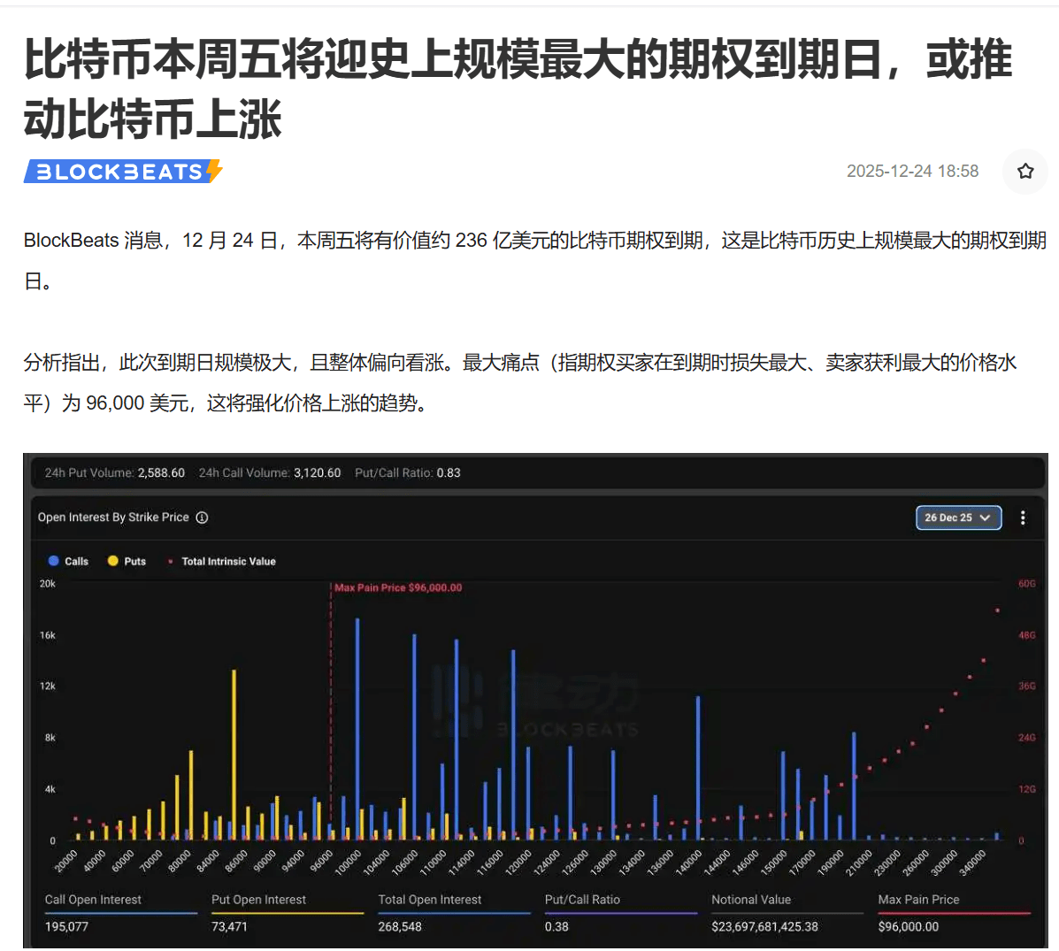 The Bitcoin options expiring this Friday are valued at $23.6 billion, the largest options expiration in history. The key point is set at $96,000—this means that before expiration, whales and institutions have a strong incentive to push the price towards this level to let the maximum number of options contracts expire worthless (maximizing profits for sellers). This undoubtedly injects a strong 'upward gravity' into the market. However, the expiration of options is both a catalyst and could potentially be a turning point where the 'good news is fully priced in'; once the price is pushed up and fails to hold, selling pressure will surge like a flood.