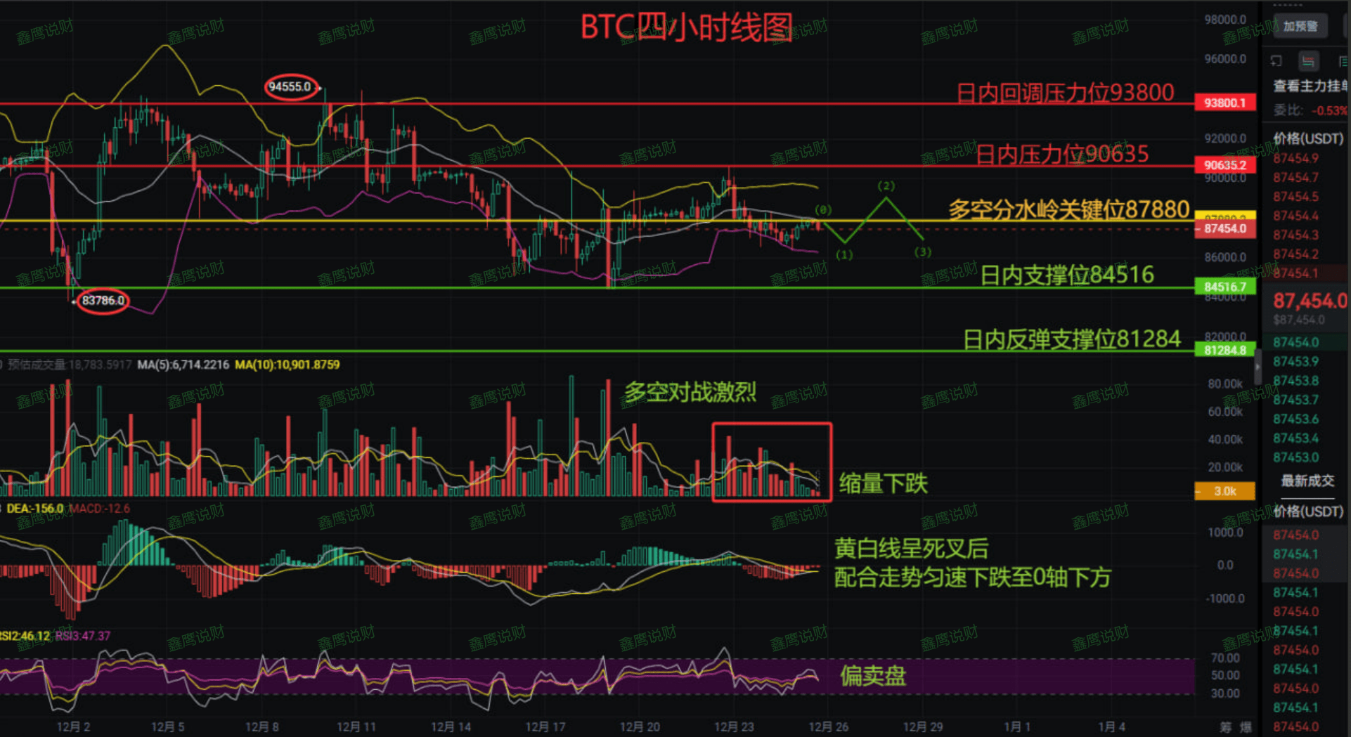 The options game of whales and the technical bearish signals are in fierce conflict. I believe that before the expiration on Friday, the market may first pursue an 'expected trend,' attempting to test the 90635-93800 resistance area upwards, and even approaching the maximum pain point of 96000. However, this could very well be a bull trap. If the price rises but the volume cannot sustain the increase and stagnation occurs at the resistance level, a sharp drop of 'buy the expectation, sell the fact' is likely to occur, testing the 84516-81284 support range downwards. The overall strategy should be 'mainly short on rebounds, with quick drops capturing rebounds as a supplement.'