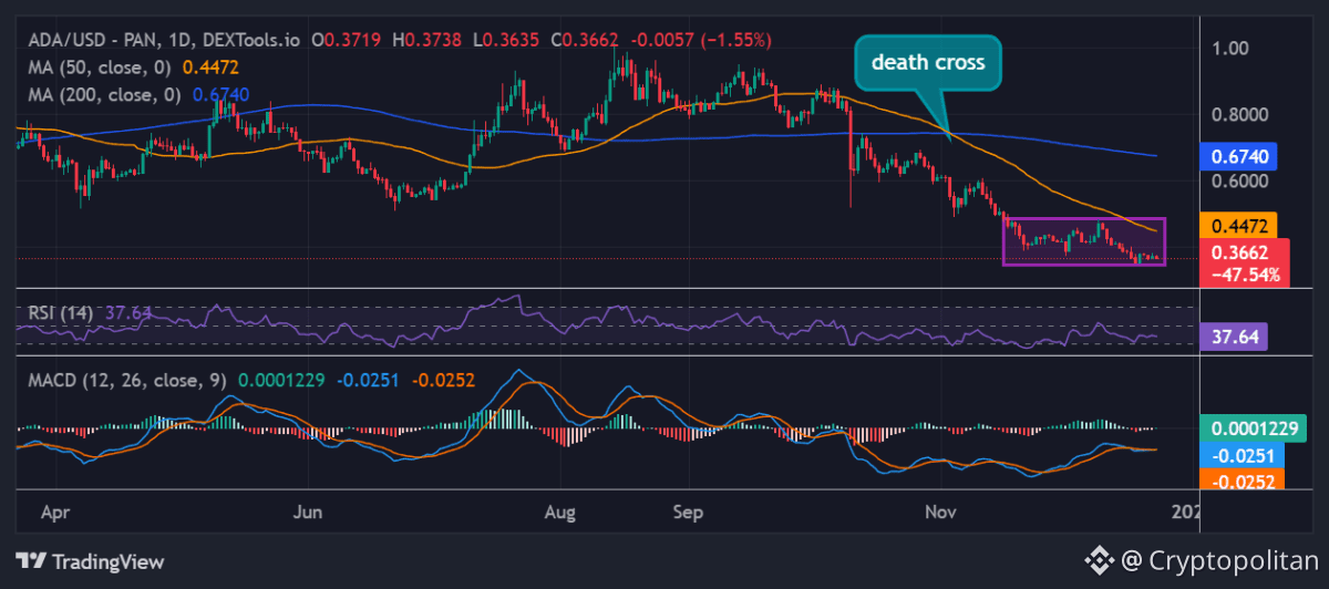 The Relative Strength Index (RSI) is at 37.64. This indicates to traders that while the price is plummeting, it has not yet reached the lowest point. Should it not remain above $0.36, it could plummet quickly to $0.27. Because of this, many people in pursuit of the best crypto to buy now are relocating funds from Cardano to new crypto projects.