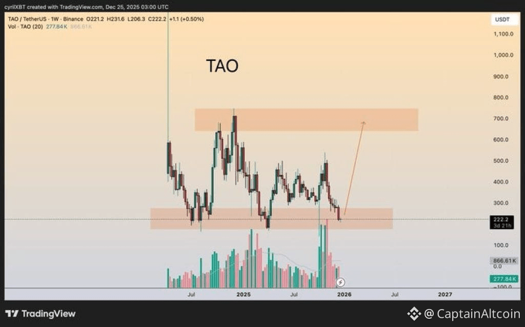 On the chart, TAO is clearly moving inside a wide range. The lower box acts as support, while the upper box acts as resistance. Price is currently closer to the lower end of that range, which is why this area matters so much.