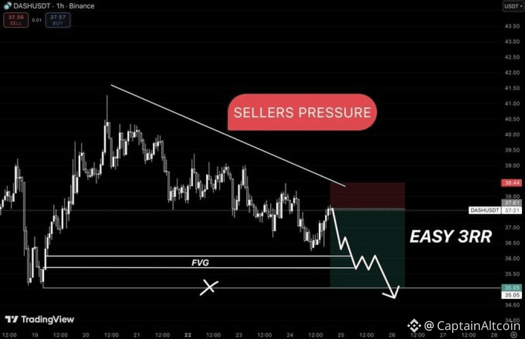Dash (DASH) is still being sold, and the chart does not show any real change yet. Each small bounce meets sellers, and the downtrend remains.
