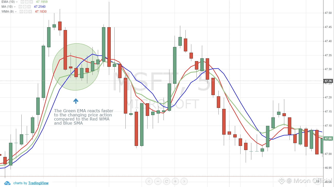 EMA gives more weight to recent prices, so it reacts faster.