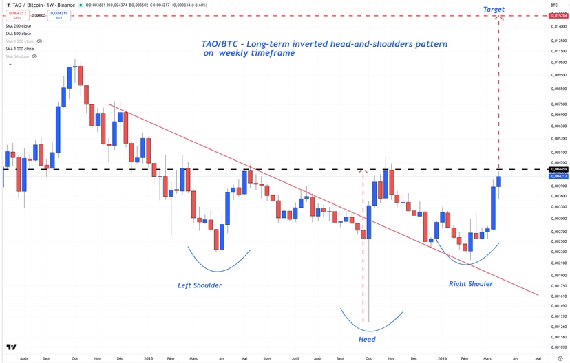 Si se rechaza aquí de nuevo, entonces realmente no ha cambiado nada estructuralmente. Solo significa que TAO todavía está luchando por superar a BTC y cada impulso hacia la fortaleza se vende.