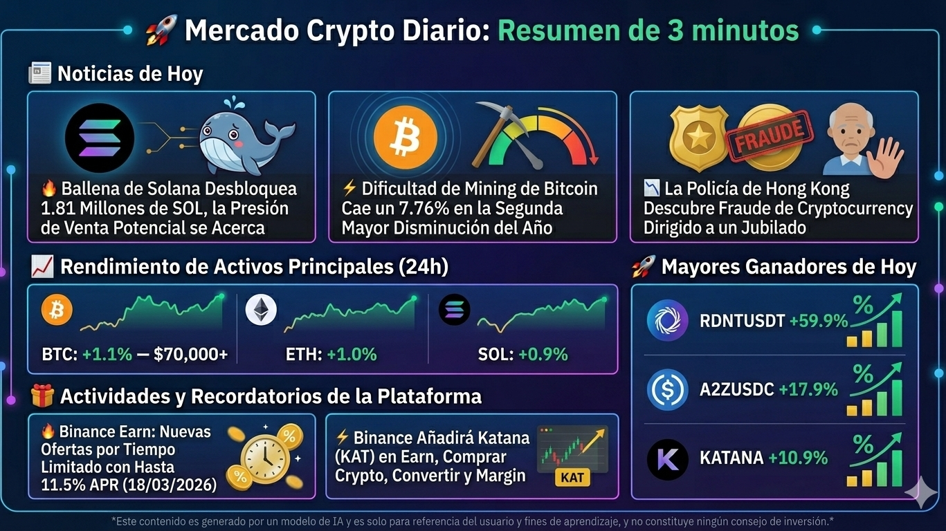 BTC: +1.1% — Bitcoin superó los $70,000, mostrando un ligero aumento en las últimas 24 horas.