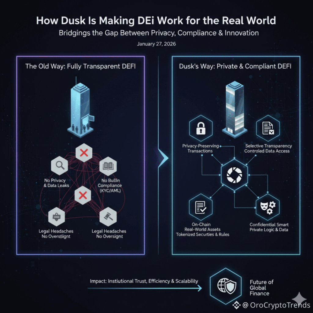 If DeFi remains fully transparent and permissionless, it may never gain the trust of banks, asset managers, or major institutions. The lack of privacy and compliance features is simply too risky. But with solutions like Dusk, the industry can bridge the gap: