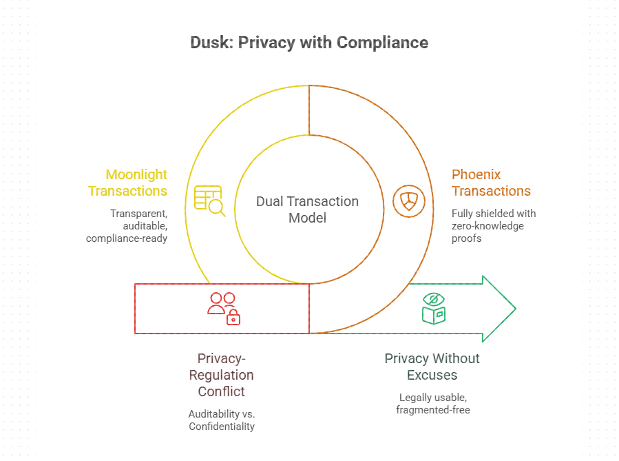 Misma cadena. La misma liquidez. Diferentes niveles de privacidad dependiendo del caso de uso. Esto evita la fragmentación mientras se mantiene legalmente utilizable.