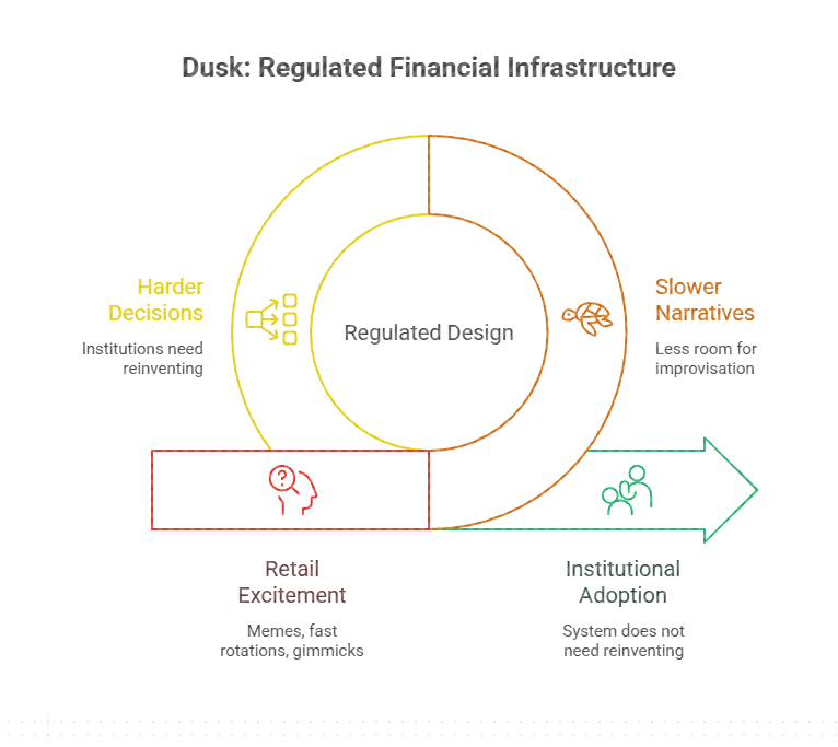 Seamos directos: si estás buscando memes, rotaciones rápidas o trucos virales de DeFi, Dusk no está construido para ti. Nunca lo estuvo.