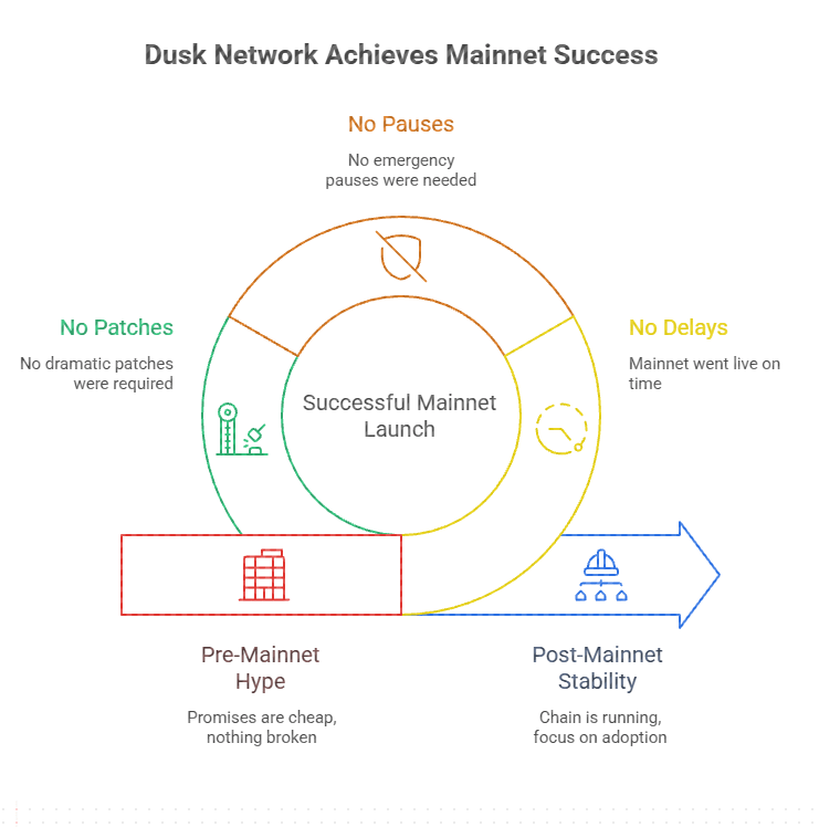 La mainnet se lanzó el 7 de enero después de seis años de desarrollo. Sin retrasos. Sin pausas de emergencia. Sin parches dramáticos. La cadena está en funcionamiento, los bloques están finalizando, y el enfoque ha cambiado de la óptica de lanzamiento hacia la adopción y ejecución. Eso por sí solo coloca a Dusk en una minoría muy pequeña.