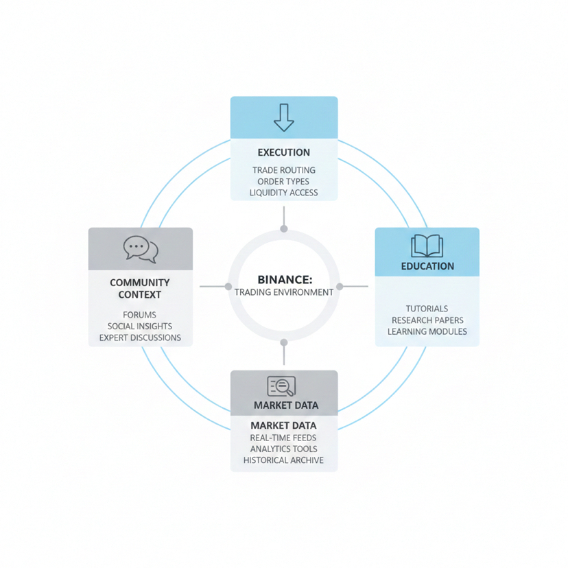 Binance no es solo donde ocurren las operaciones. Es un entorno donde la ejecución, la información, el sentimiento y la educación existen lado a lado. La mayoría de los usuarios interactúan solo con una de esas capas.