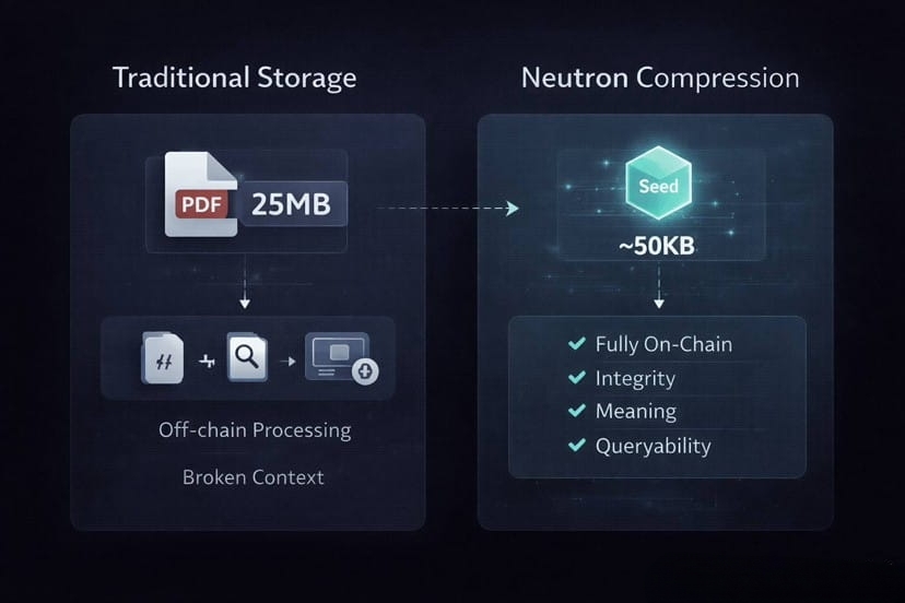 Según la documentación de Vanar, Neutron puede reducir archivos medidos en decenas de megabytes a Seeds medidos en decenas de kilobytes mientras mantiene su estructura semántica intacta. Estas Seeds viven en la cadena y pueden ser verificadas, referenciadas y consultadas directamente.