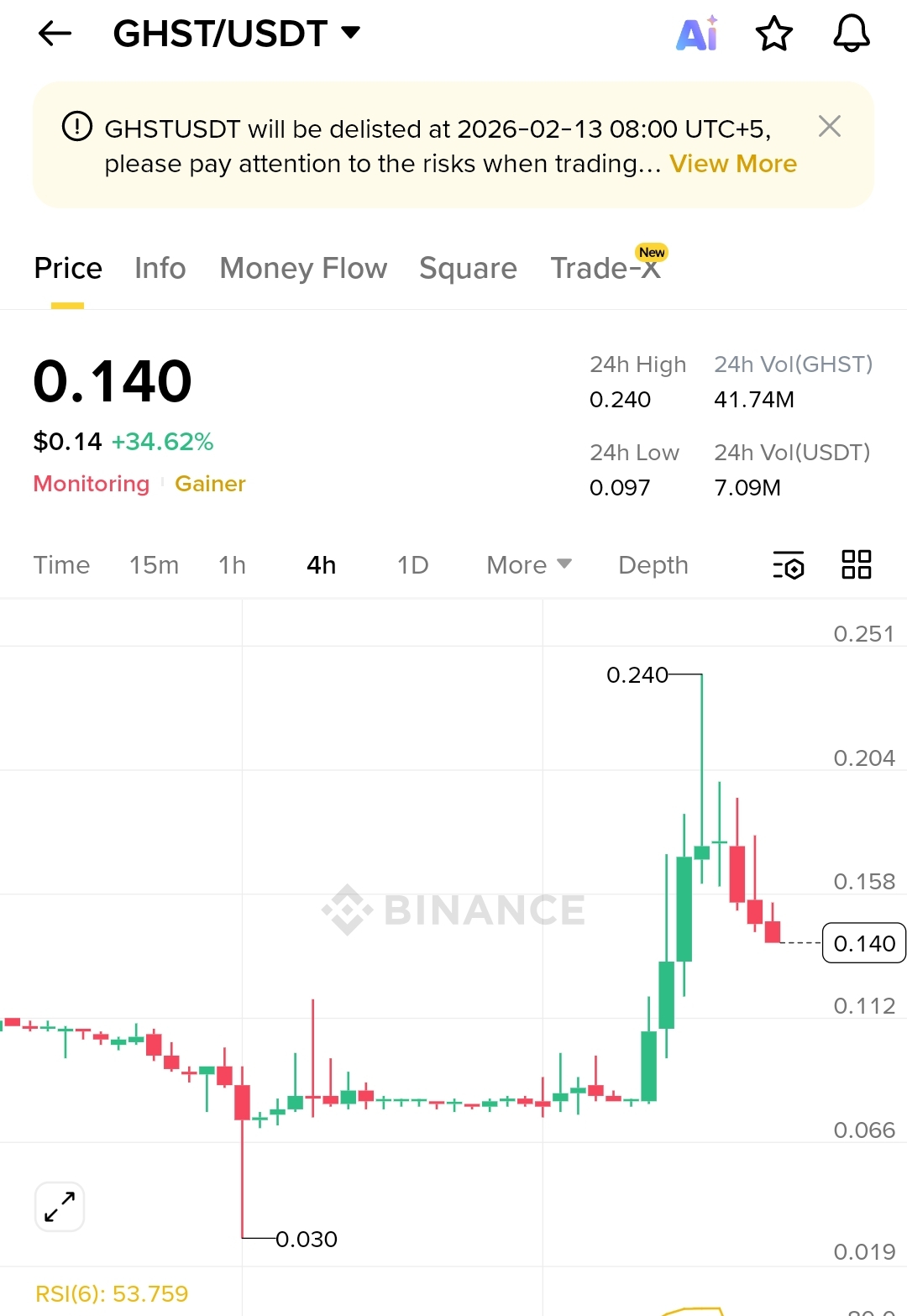 Aavegotchi (GHST) is currently experiencing extreme volatility as it approaches a major exchange transition: Binance will officially delist $GHST on February 13, 2026. While the initial announcement on February 2 triggered a sharp double-digit decline, the token has seen an unexpected 83.63% intraday price surge within the last 24 hours to reach approximately $0.15. This "pump" is characterized as a high-volatility speculative event, likely driven by traders closing out short positions (a short squeeze) and a spike in trading volume as liquidity prepares to migrate to decentralized venues like Base, where the project recently completed its full migration.