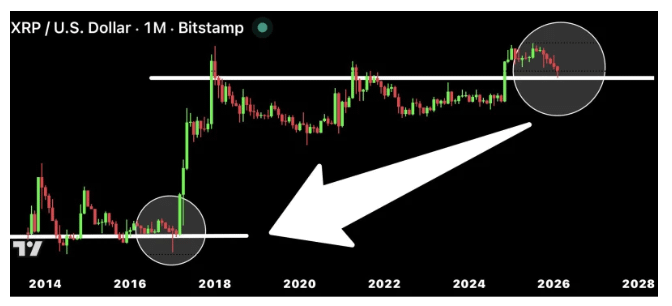 $XRP a imprimé cinq bougies rouges mensuelles consécutives, correspondant exactement à la séquence observée avant le rallye historique de 2017 qui a porté le jeton de 0,006 $ à plus de 3 $. Le graphique montre maintenant une structure macro similaire se formant dans une zone de support critique.