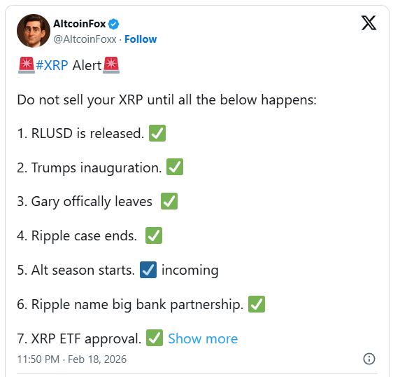 Le commentaire souligné par AltcoinFox capture cet état d'esprit évolutif. Le trader Bitcoin à long terme soutient que les catalyseurs définissant XRP s'étendent au-delà des cycles de prix et dépendent plutôt d'une séquence de développements macroéconomiques qui signalent collectivement la maturité, en avertissant contre la vente prématurée de XRP.