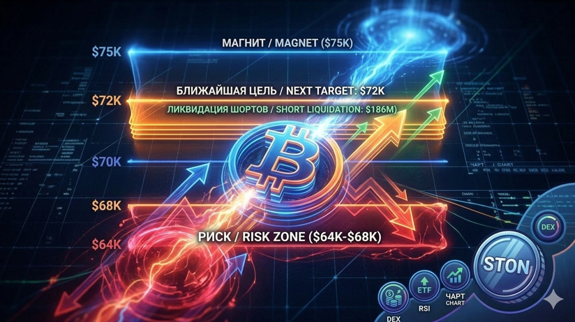 Risques : MalgrĂ© la hausse, en bas (plage 64 000 $â68 000 $) s'est accumulĂ©e 4 fois plus de liquiditĂ©s. Les analystes prĂ©viennent : aprĂšs la prise de 72K, un retournement brusque est possible pour « collecter » des ordres infĂ©rieurs.