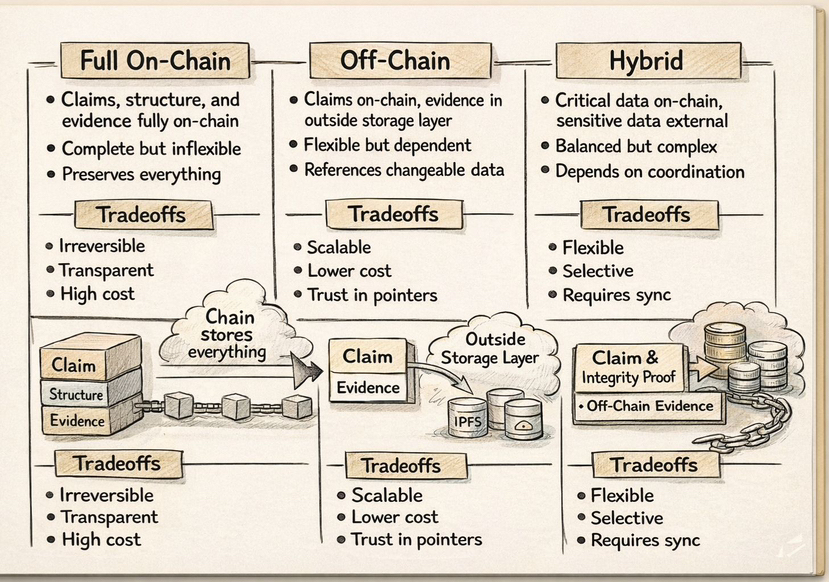 It is no longer about whether data should be stored on-chain or off-chain. It becomes a question of what part of the attestation needs to remain independently verifiable, even if everything else around it changes.