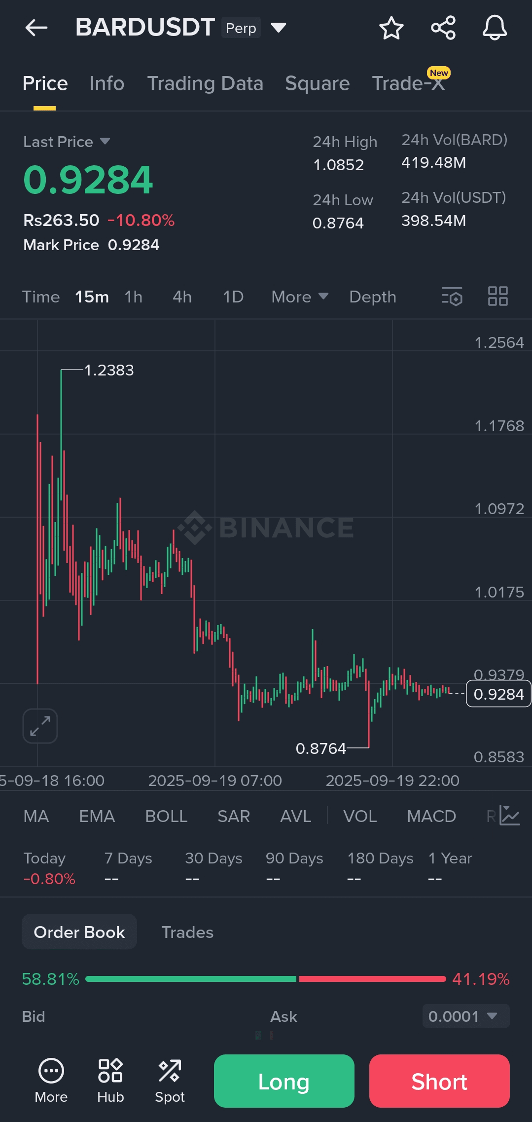 Kontrak permanen BARD/USDT mengalami tekanan jual yang signifikan hari ini, dengan harganya turun tajam sebesar 10.80% untuk diperdagangkan di 0.9284 USDT. Penurunan tajam ini menempatkan token di antara pecundang yang signifikan di sesi ini, mencerminkan sentimen bearish yang kuat di pasar.