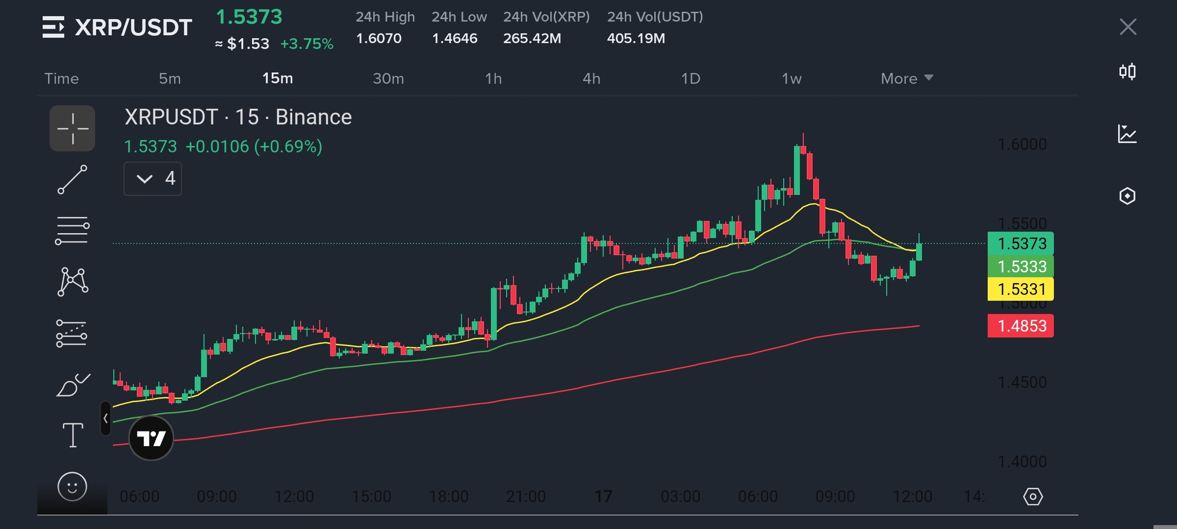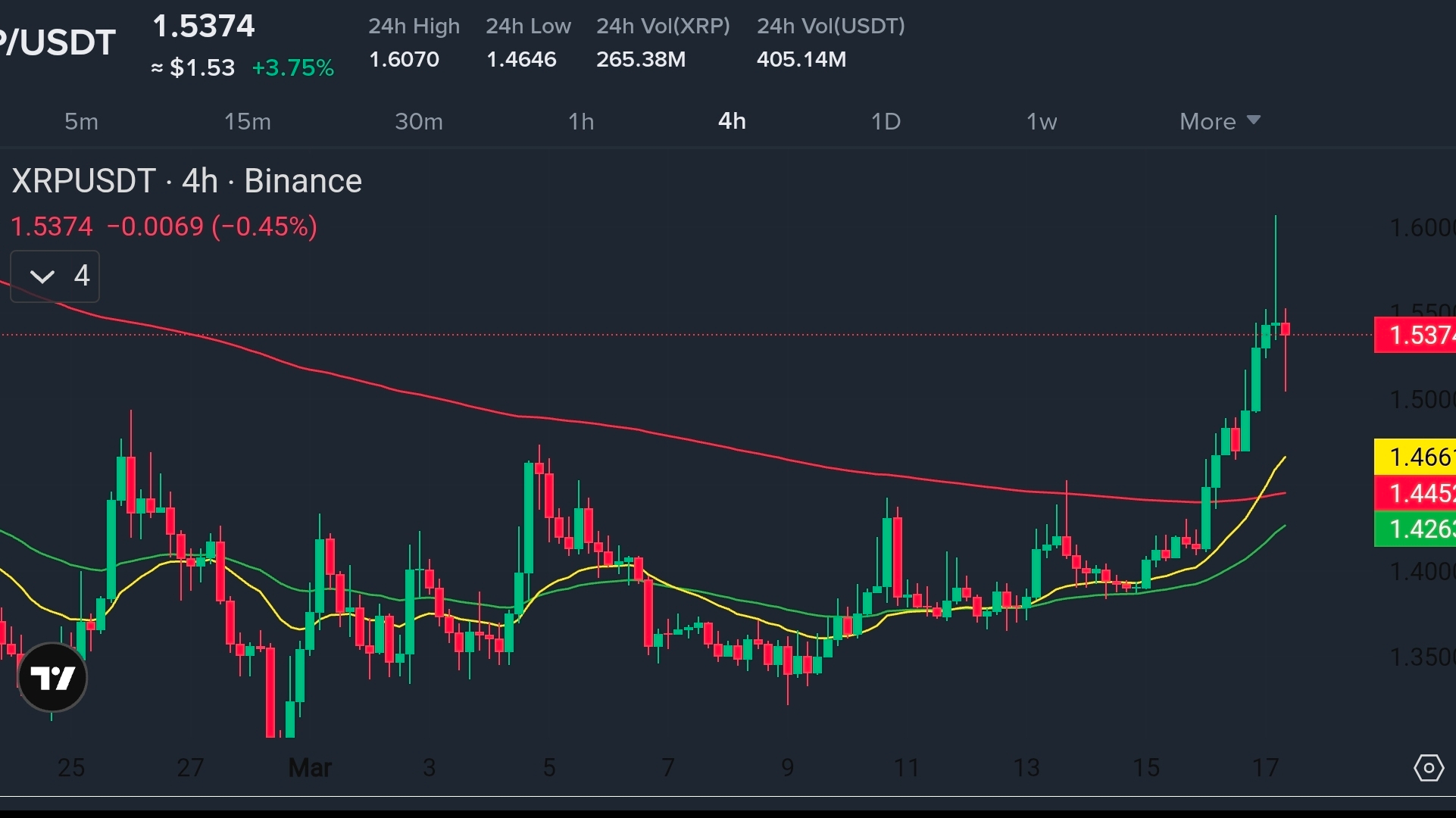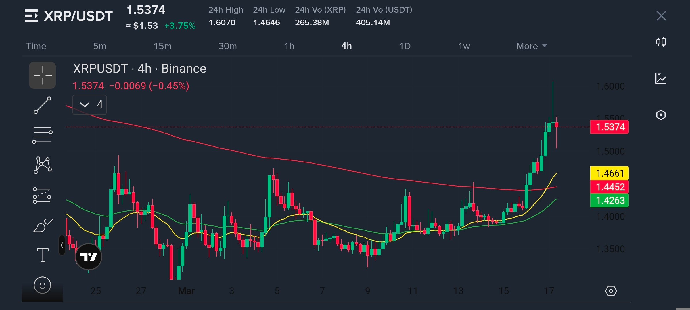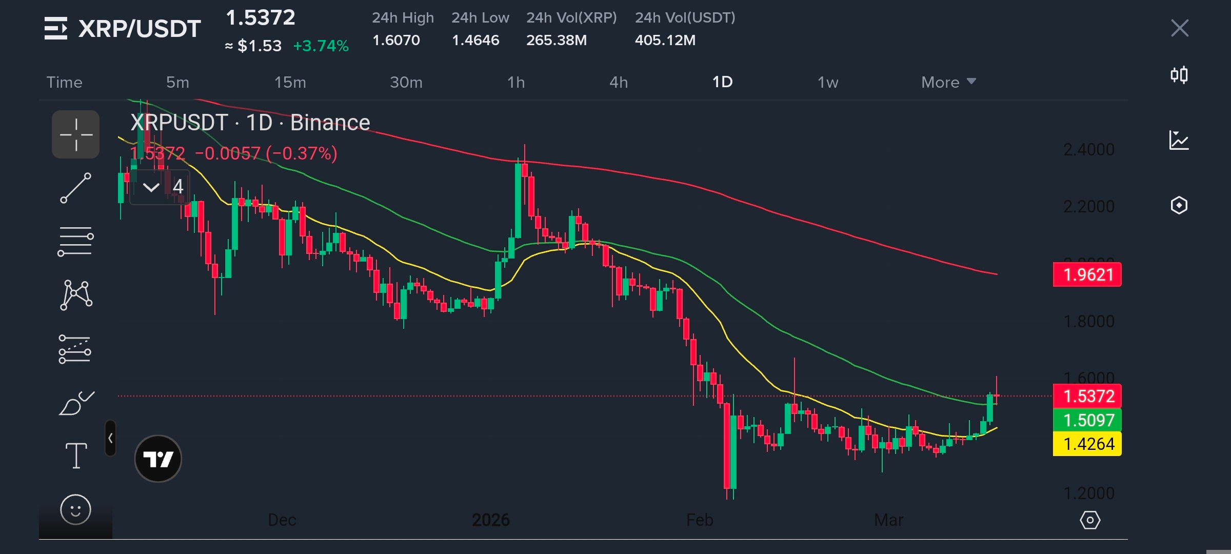 Harga mendekati $1.53 dengan volume ~$405M dan rentang $1.46–$1.60, menunjukkan aktivitas bullish yang terkontrol, tidak eksplosif.