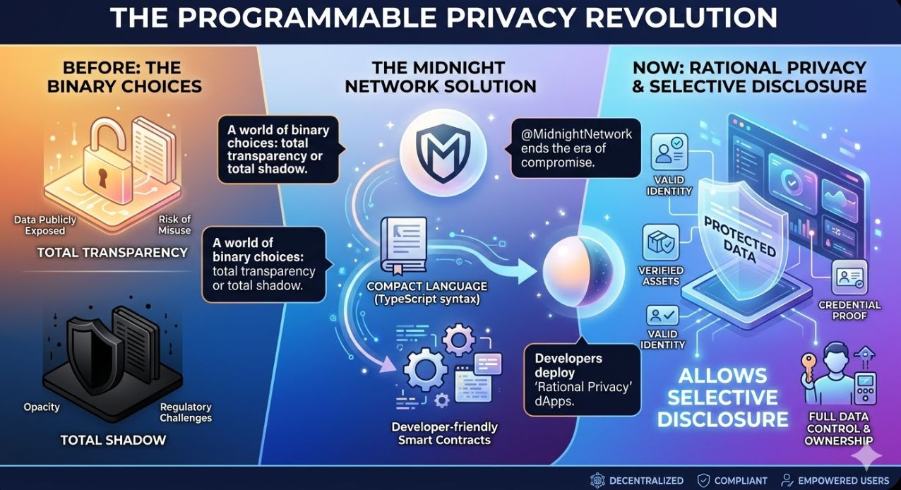 Selama bertahun-tahun, kita telah hidup dalam dunia pilihan biner: transparansi total atau bayangan total. @MidnightNetwork secara resmi telah mengakhiri era itu. Dengan memanfaatkan bahasa Compact (dibangun di atas sintaks TypeScript), pengembang sekarang sedang menerapkan dApps "Privasi Rasional" yang memungkinkan Pengungkapan Selektif.