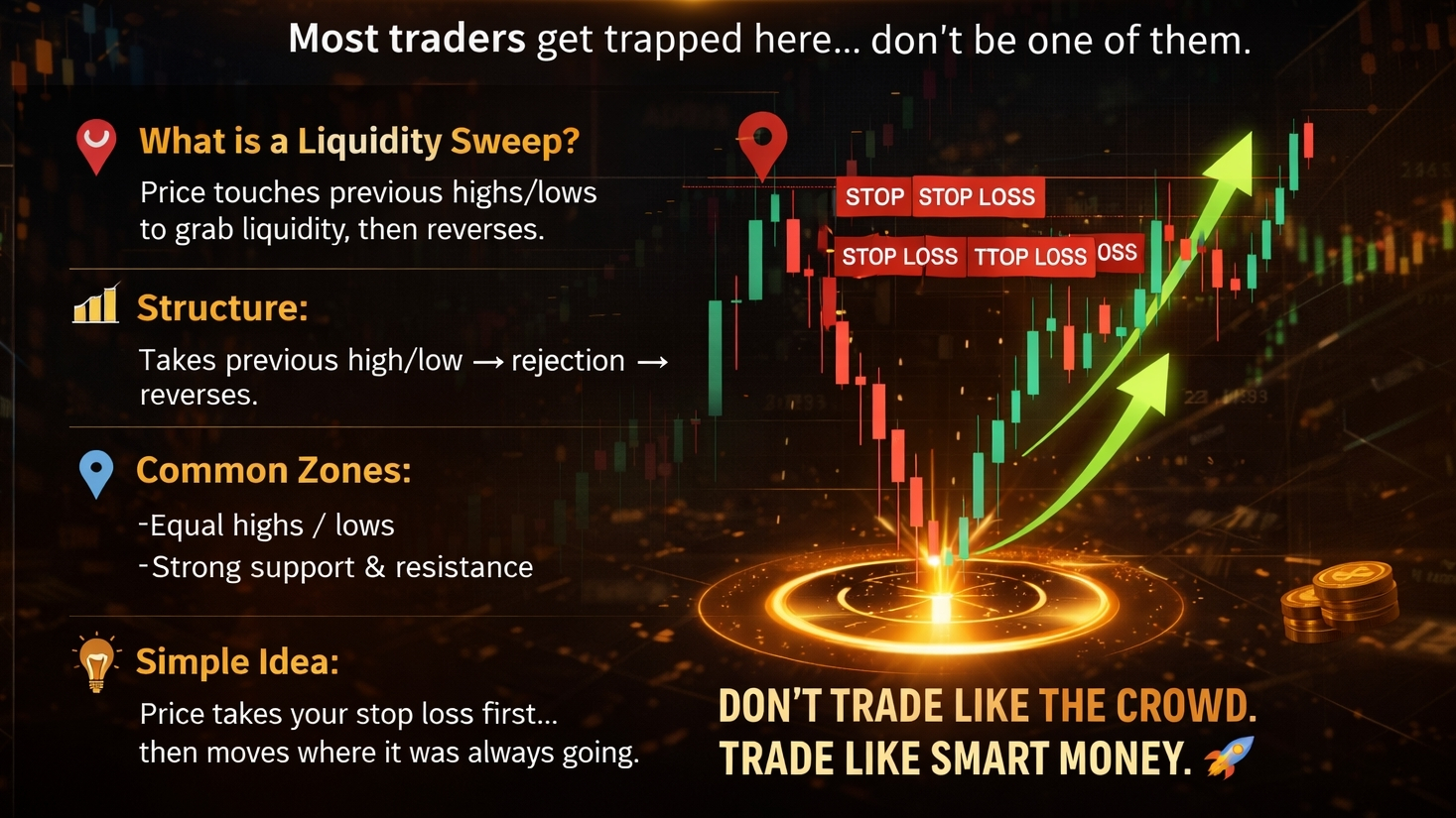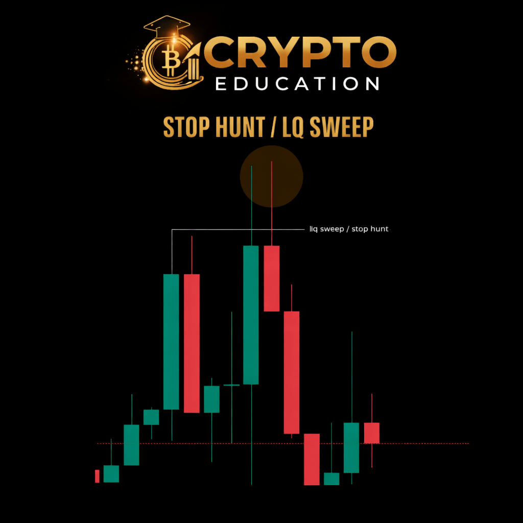 Liquidity sweep terjadi ketika harga menyentuh tinggi atau rendah sebelumnya untuk mengambil likuiditas — lalu cepat berbalik.
