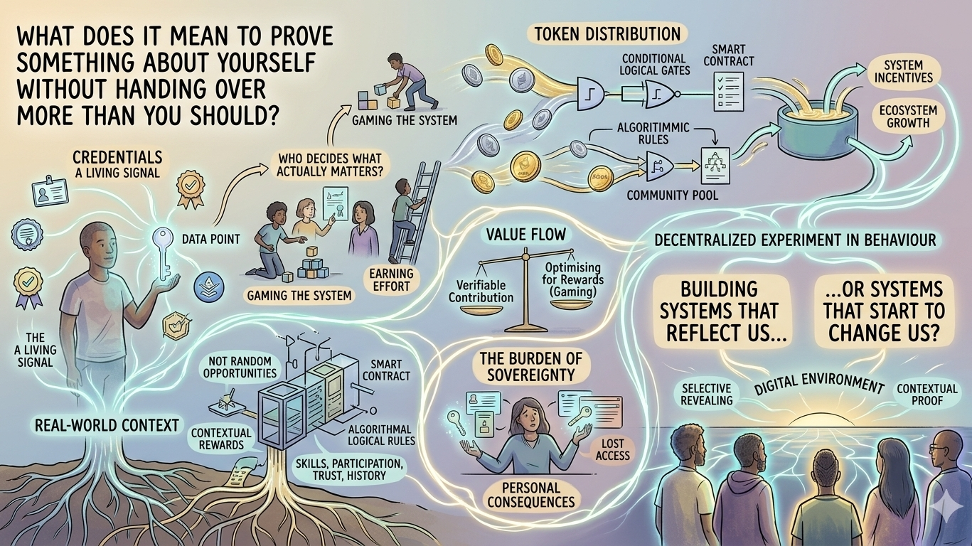 A system where value flows based on verifiable contribution. Where identity isn’t something you repeatedly hand over, but something you selectively reveal. Where distribution isn’t just broad and indiscriminate, but shaped by context, by proof, by participation.