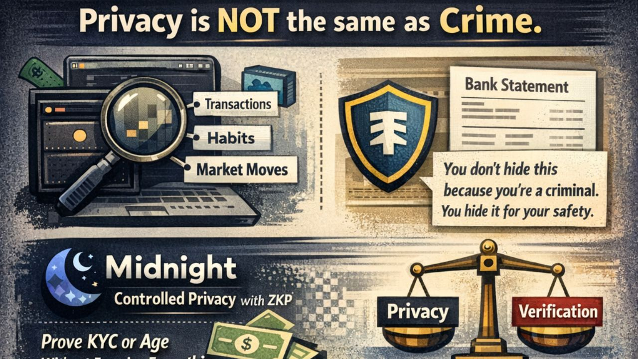 Pos tersebut menggambarkan Midnight sebagai bergerak menuju privasi yang terkendali, di mana desain berbasis ZKP dapat membiarkan pengguna membuktikan hal-hal seperti status KYC atau usia tanpa sepenuhnya mengekspos dompet itu sendiri. Itu adalah ide yang sangat berbeda dari debat lama 'semuanya publik' versus 'semuanya tersembunyi.'
