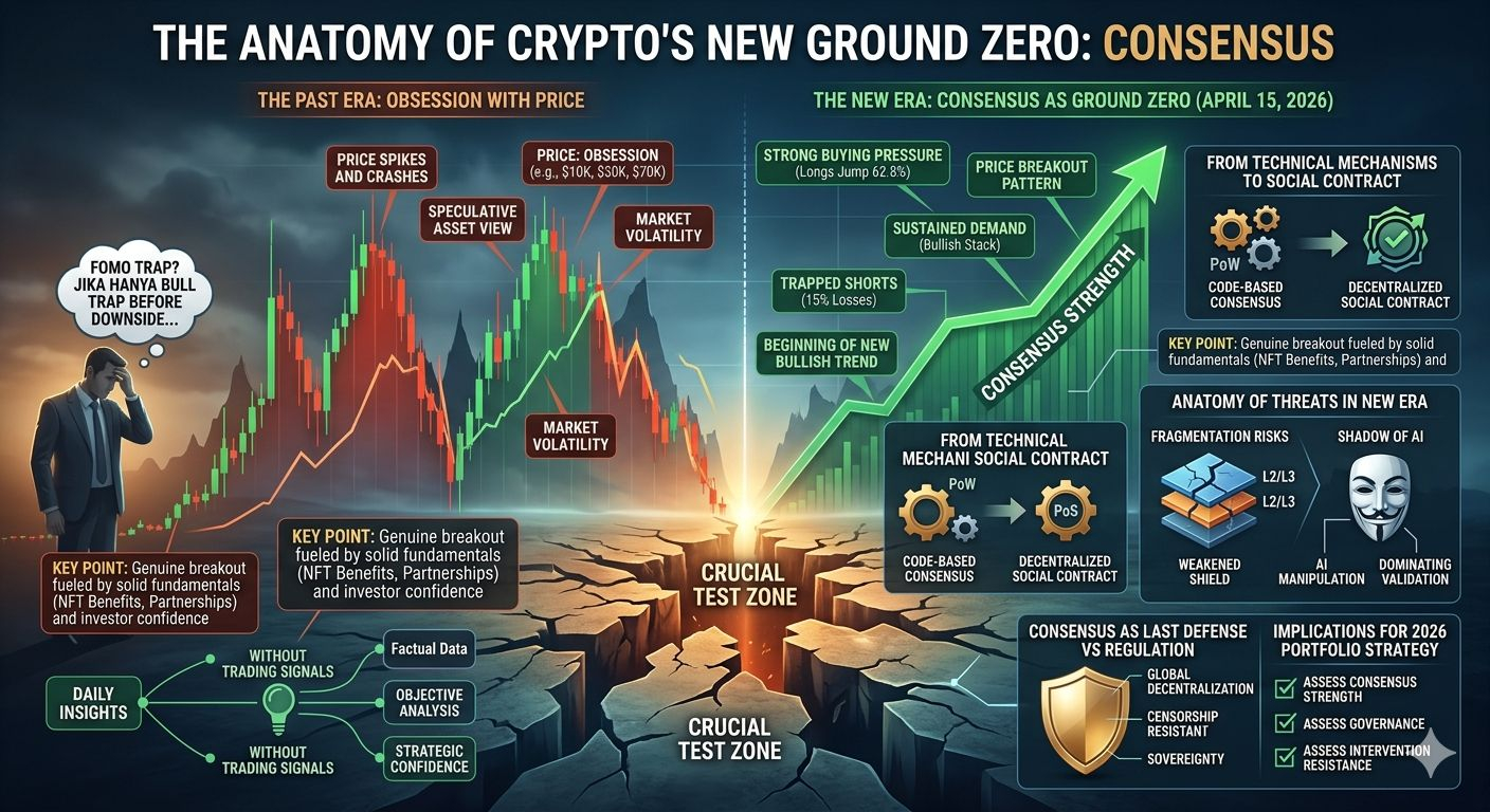 DUNIA KRIPTO (15 April 2026) – Selama satu dekade terakhir, investor kripto terobsesi pada satu angka: Harga. Namun, sebuah analisis mendalam yang dirilis di CoinDesk baru-baru ini mengguncang narasi tersebut, menyatakan bahwa medan tempur utama industri kini telah berpindah ke "Consensus" (Konsensus).