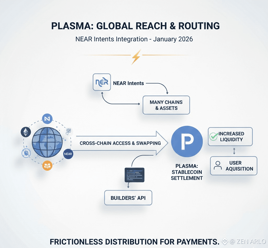 Plasma The latest meaningful update is the NEAR Intents integration announced in January 2026. The public messaging around this is focused on reach and routing, making it easier to swap across many chains and assets to and from Plasma, and giving builders an API path to bring that cross chain access inside their own products. For a payment oriented chain, this is not just a partnership headline. It is a distribution move, because stablecoin settlement wins when liquidity and users can reach the chain without friction.