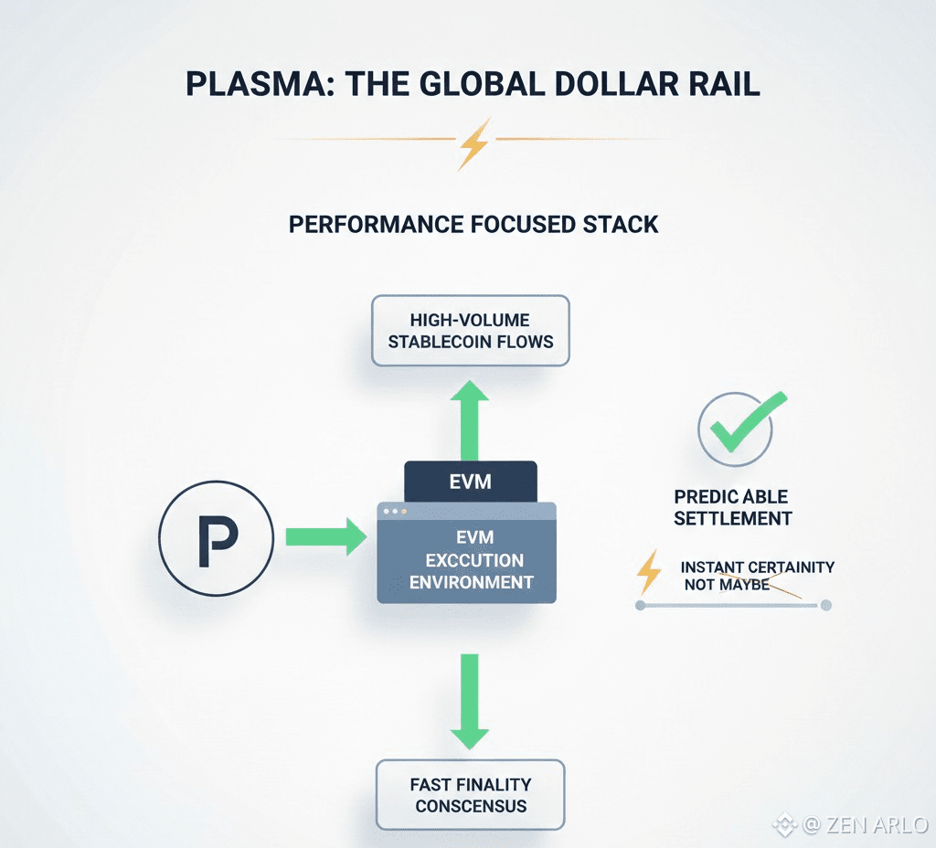 Plasma describes a performance focused stack that matches its payment goal. It pairs an EVM execution environment with a fast finality consensus design, and it frames this combination as purpose built for high volume stablecoin flows. The point is not just speed on a dashboard. The point is predictable settlement that feels final quickly, because payments need certainty, not maybe.
