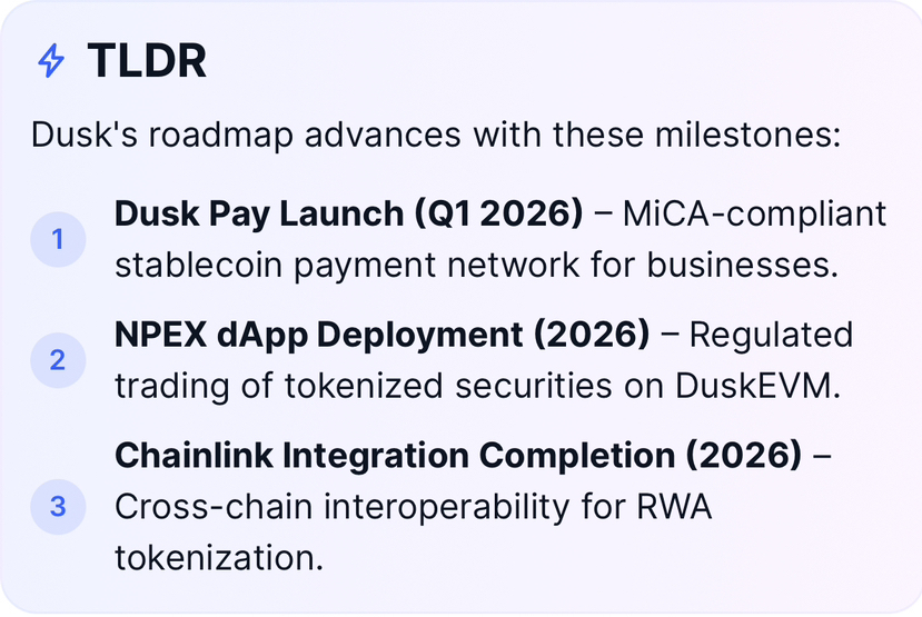 Dalam kemajuan konkret, kerjasama Dusk dengan platform sekuritas yang diatur di Belanda, NPEX, dianggap sebagai kasus eksplorasi penting untuk arah RWA-nya. Meskipun skala aset konkret masih perlu menunggu konfirmasi dari sumber yang berwenang, kerjasama ini sendiri sudah menandakan bahwa Dusk sedang bergerak dari bukti konsep menuju pengujian nyata di pasar yang diatur. Sementara itu, perencanaan Dusk Pay yang berfokus pada kepatuhan MiCA untuk pembayaran dan penyelesaian juga menunjukkan bahwa ia tidak hanya berhenti pada tingkat tokenisasi aset, tetapi sedang mencoba membangun jalur keuangan tingkat institusi yang lengkap.