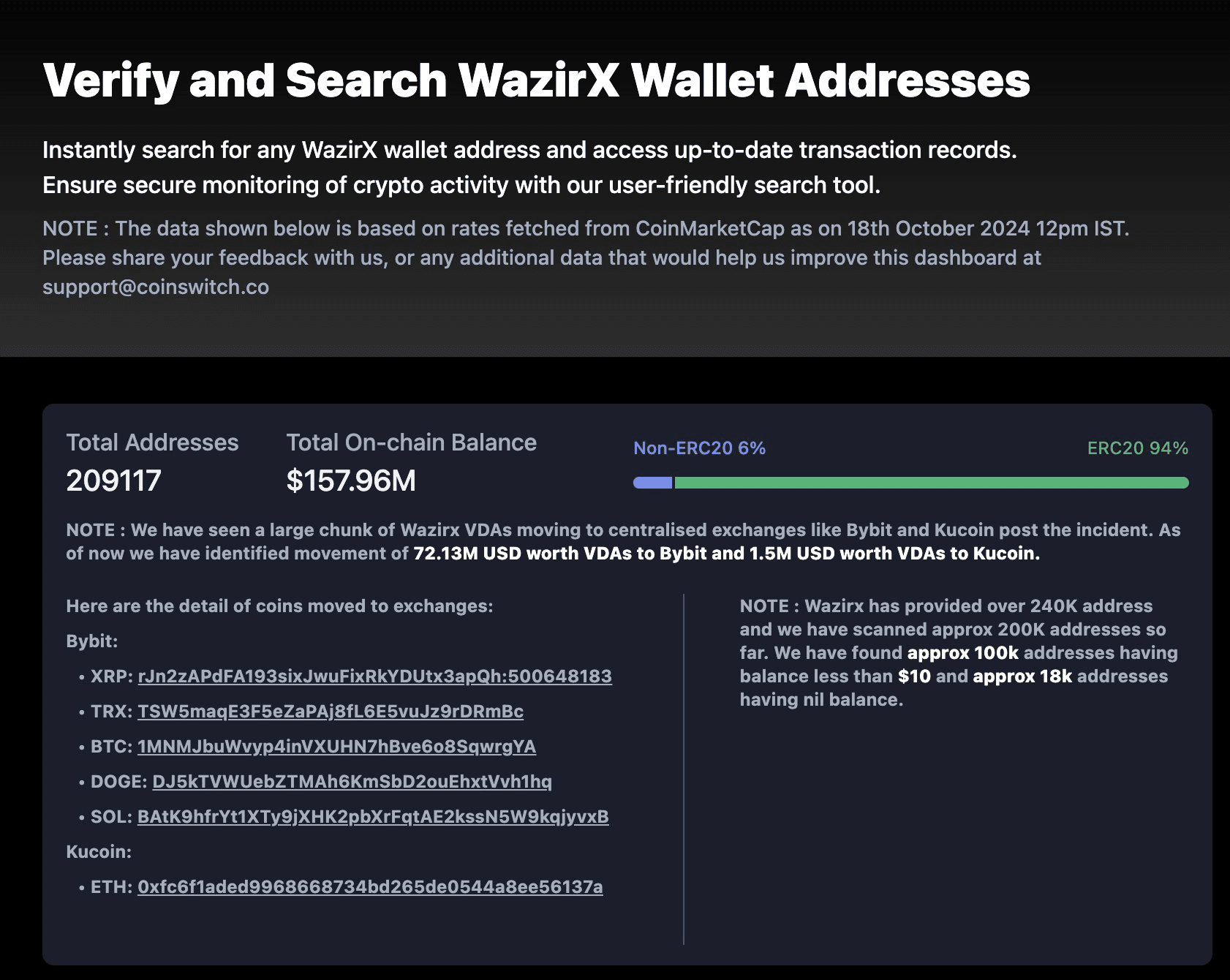 Il trasferimento di fondi a ByBit è stato reso noto dal CEO di CoinSwitch, Ashish Singhal, che ha rivelato che WazirX ha trasferito anche 1,5 milioni di dollari a KuCoin, società registrata presso la FIU. Ha fornito una dashboard in tempo reale di oltre 240.000 indirizzi di wallet pubblici divulgati da WazirX, a seguito di un'ordinanza del tribunale di Singapore.
