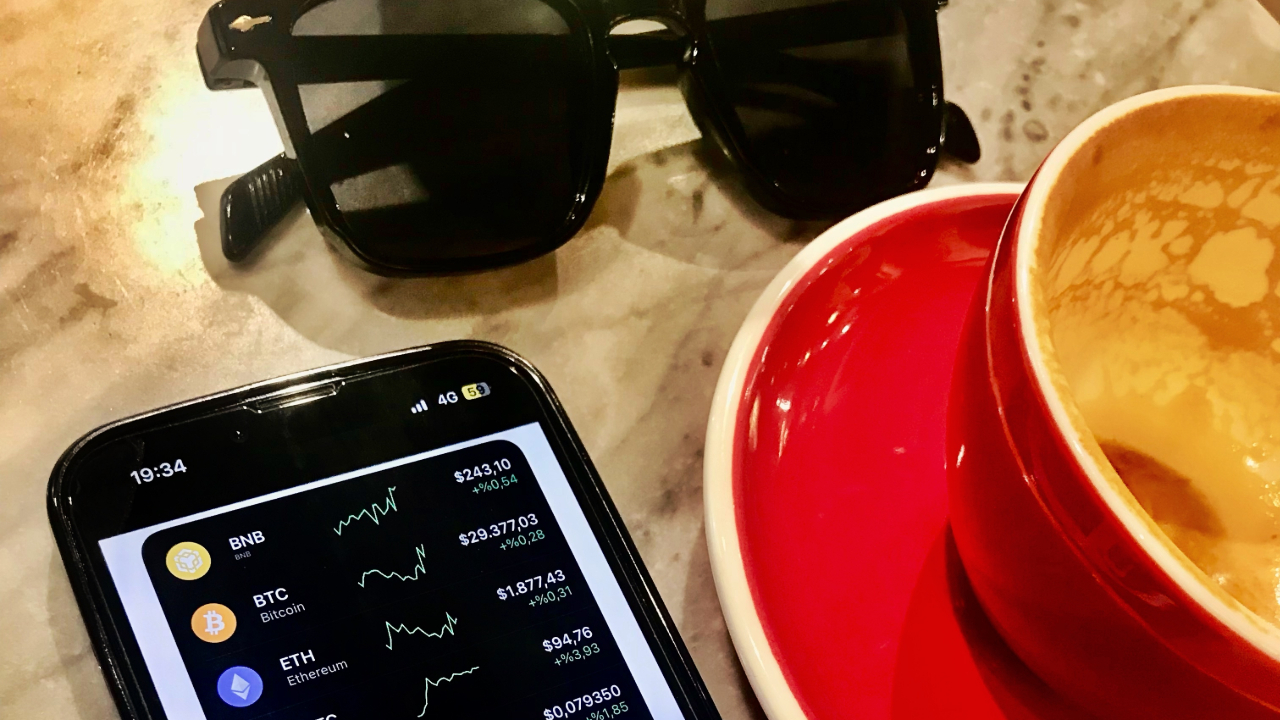 un telefono sul tavolo, una tazza di caffè, occhiali da sole a lato… e Bitcoin sullo schermo 📱