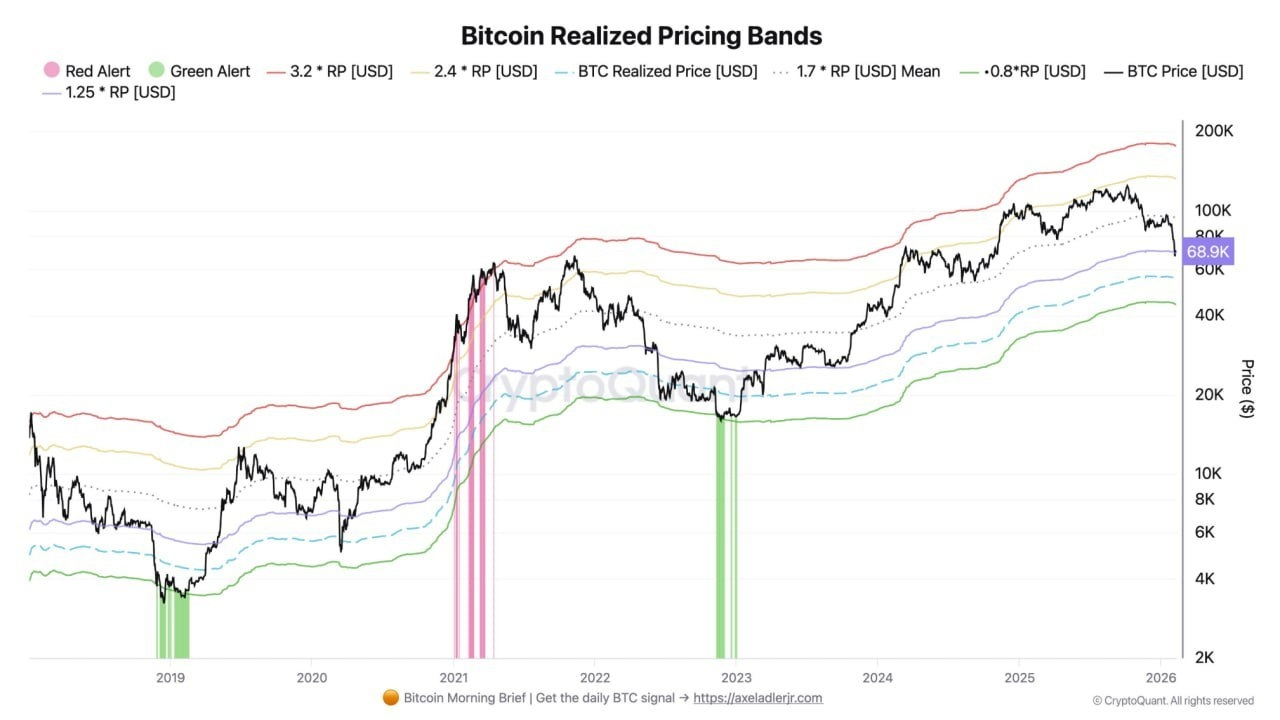 Price is currently testing the 1.25× Realized Price band, a historically critical zone that separates normal corrections from full capitulation phases.