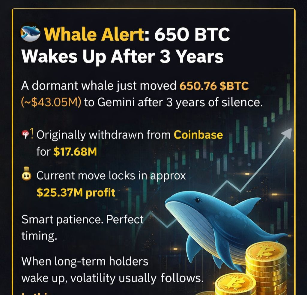 A dormant whale just moved 650.76 $BTC (~$43.05M) to Gemini after 3 years of silence.