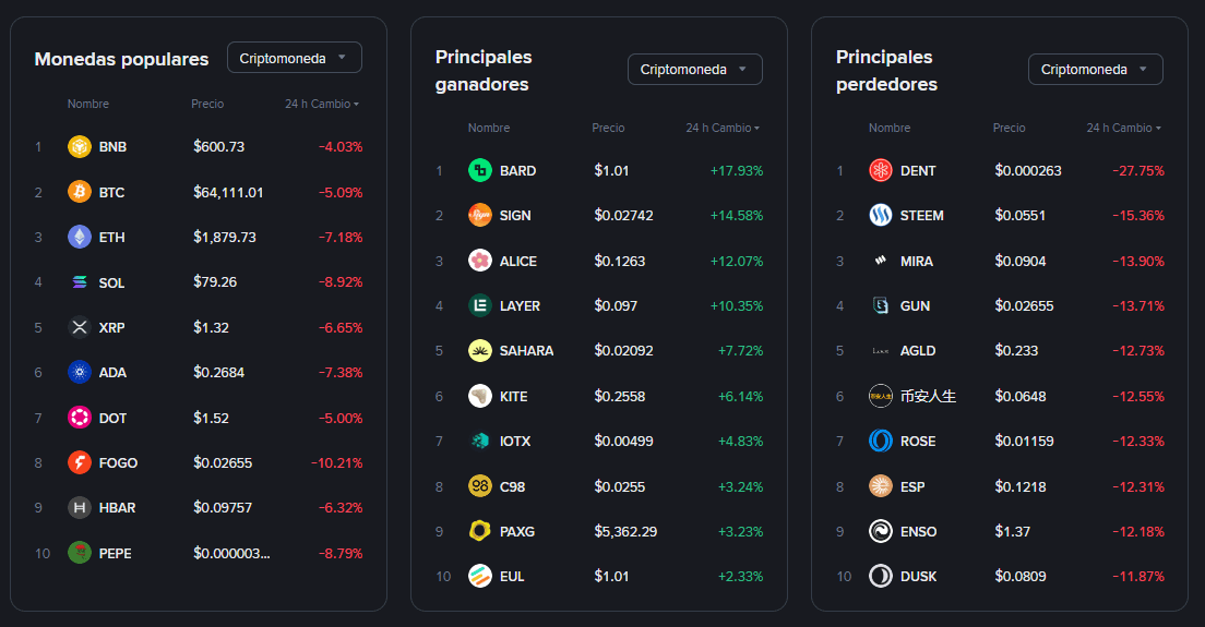 Especulación Extrema: Mientras el mercado general cae, tokens de bajísima liquidez como GWEI (+27.85%) o BARD (+17.93%) presentan subidas volátiles que suelen preceder a caídas bruscas.