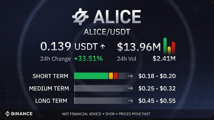 Rischi: Token a bassa capitalizzazione estremamente volatile. Potrebbe tornare rapidamente al supporto di $0.11 in caso di realizzo dei profitti. Gioco ad alto rischio solo. Non è un consiglio finanziario — i prezzi si muovono a una velocità fulminea su Binance. Fai sempre le tue ricerche, usa gli stop-loss e non investire mai più di quanto puoi permetterti di perdere. Controlla il grafico live delle 4 ore & il volume sull'app di Binance proprio ora!#ALICE #MarketRebound #MyNeighborAlice #Binance #BlockAILayoffs $ALICE