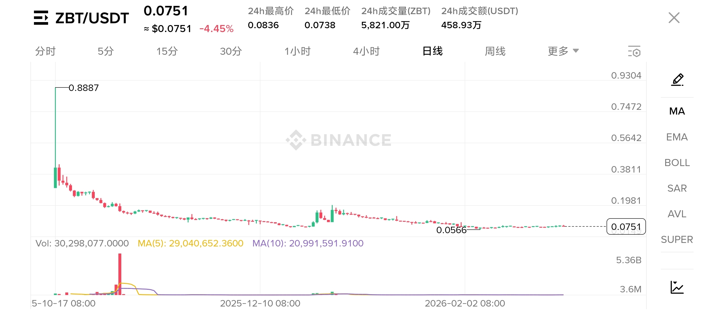 Fratelli, guardando questo grafico K, il vostro cuore sta sanguinando! ZBT al momento dello screenshot, è sceso del 4,45% nelle ultime 24 ore, il prezzo attuale è solo 0,0751 USDT, il minimo nelle 24 ore ha toccato 0,07338, il volume delle transazioni è salito a 59820000 (circa 4720000 USDT).