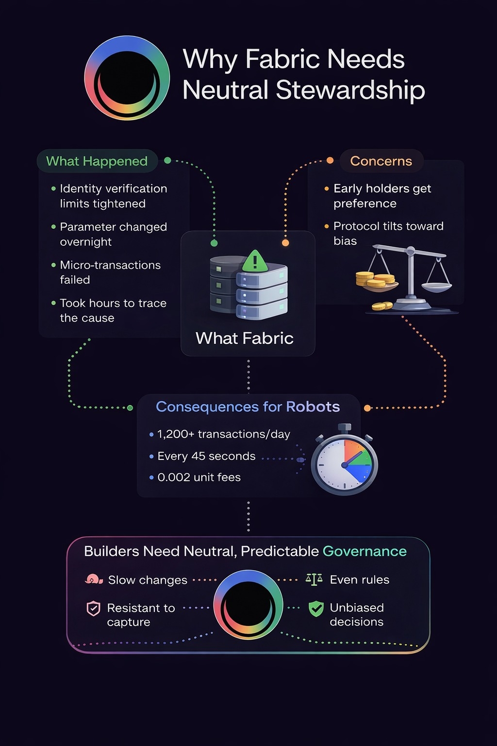Il layer di identità di Fabric diventa infrastruttura nel momento in cui i robot iniziano a dipendere da essa. L'infrastruttura non può comportarsi come un progetto token. Non può inclinarsi verso i primi detentori, i validator preferiti o i segnali economici a breve termine. La Fondazione Fabric, se esiste per servire il protocollo, deve operare quasi invisibilmente. Neutra. Noiosa. Prevedibile.