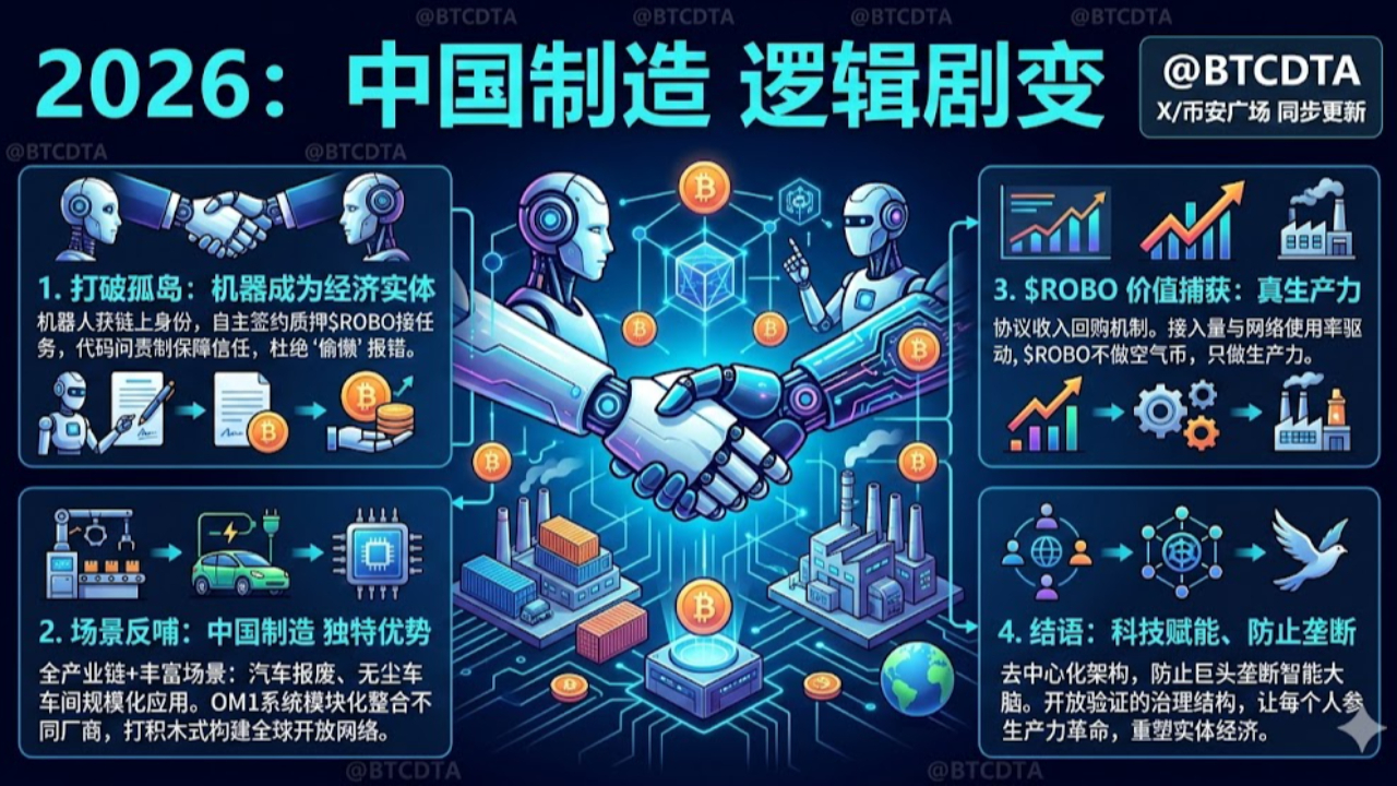 Il 2026 è l'anno fondamentale per l'applicazione su larga scala dei robot umanoidi. Nella officina di rottamazione auto dell'Henan e nella sala bianca dei semiconduttori del Jiangsu, decine di migliaia di robot stanno lavorando ad alta intensità. L'architettura modulare di @FabricFoundation è molto flessibile; non necessita di rovesciare gli standard industriali esistenti, ma, proprio come costruire con i mattoncini, attraverso il sistema operativo OM1, può unire questi diversi fornitori e forme di macchine in una rete aperta globale.