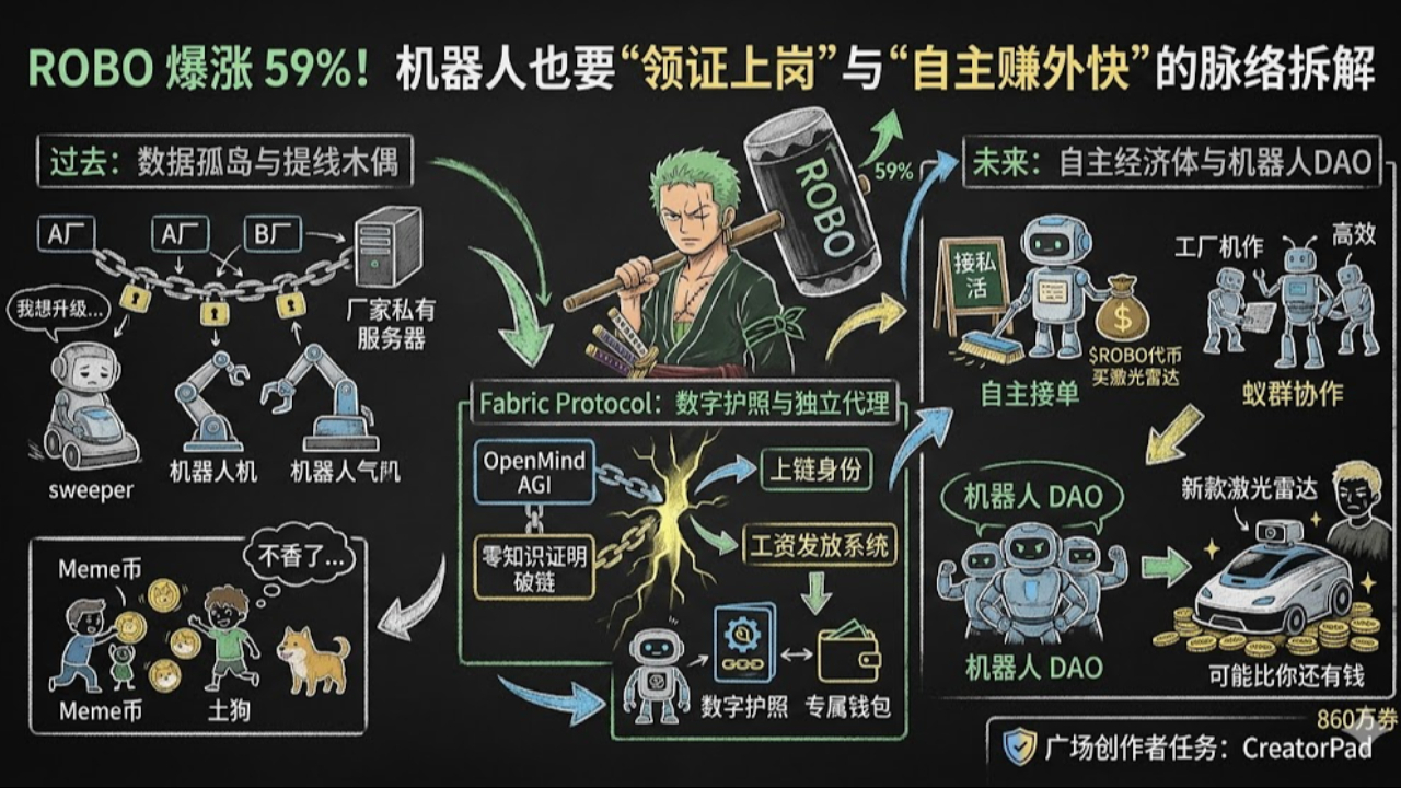 兄弟,你有没有想过,你家里那个只会撞墙傻傻的扫地机器人,有一天能自己“接私活”赚外快,甚至攒钱给自己买个新款激光雷达?在AI浪潮快把社交平台淹没的2026年,ROBO 像一记重锤砸进了币安广场,暴涨59%的数据让那群还在玩Meme币的土狗们看傻了眼。由 @Fabric Foundation 推出的 Fabric Protocol,根本不是什么玄学叙事,它是在给机器人修“工资发放系统”和“数字身份证”。如果你还看不懂广场创作者任务台那860万ROBO代币券背后的逻辑,那你可能真的要被这个时代落下了。