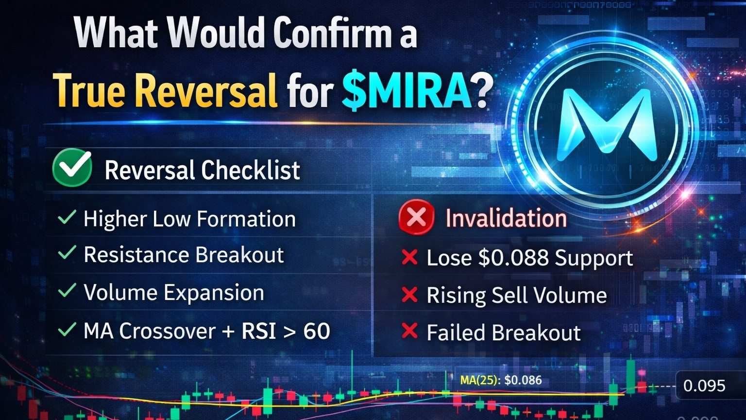 $MIRA ha trovato stabilitĂ vicino alla zona $0,088â$0,089 dopo una correzione di diverse settimane. Si sta formando un consolidamento, ma la sola stabilizzazione non equivale a un'inversione.