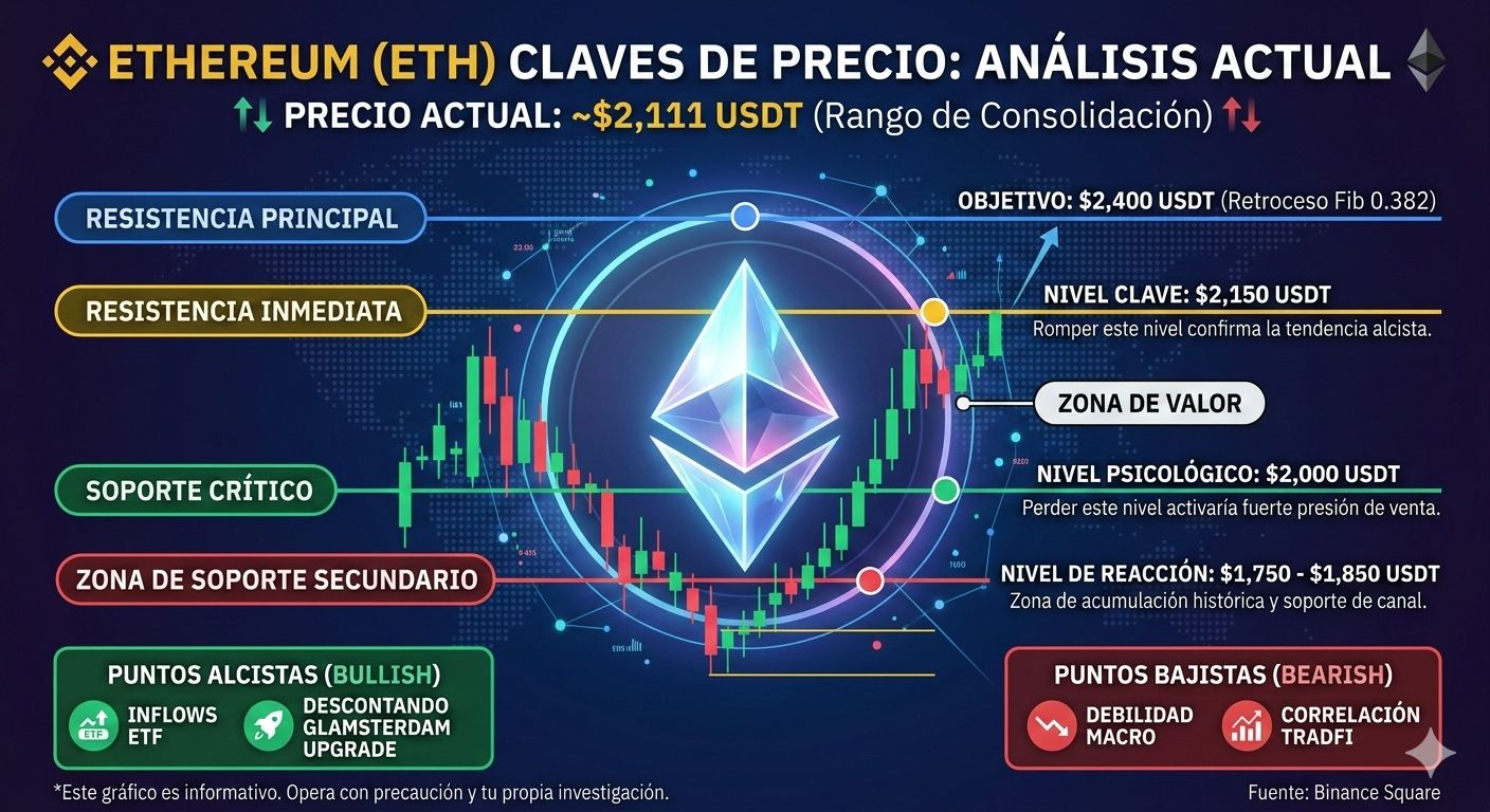 Tras un inicio de año volátil marcado por factores macroeconómicos, #Ethereum se encuentra en una fase crítica de consolidación. Actualmente, el precio fluctúa en el rango de los $2,090 - $2,120 USDT, mostrando señales de recuperación tras haber tocado mínimos locales cercanos a los $1,900 en febrero.