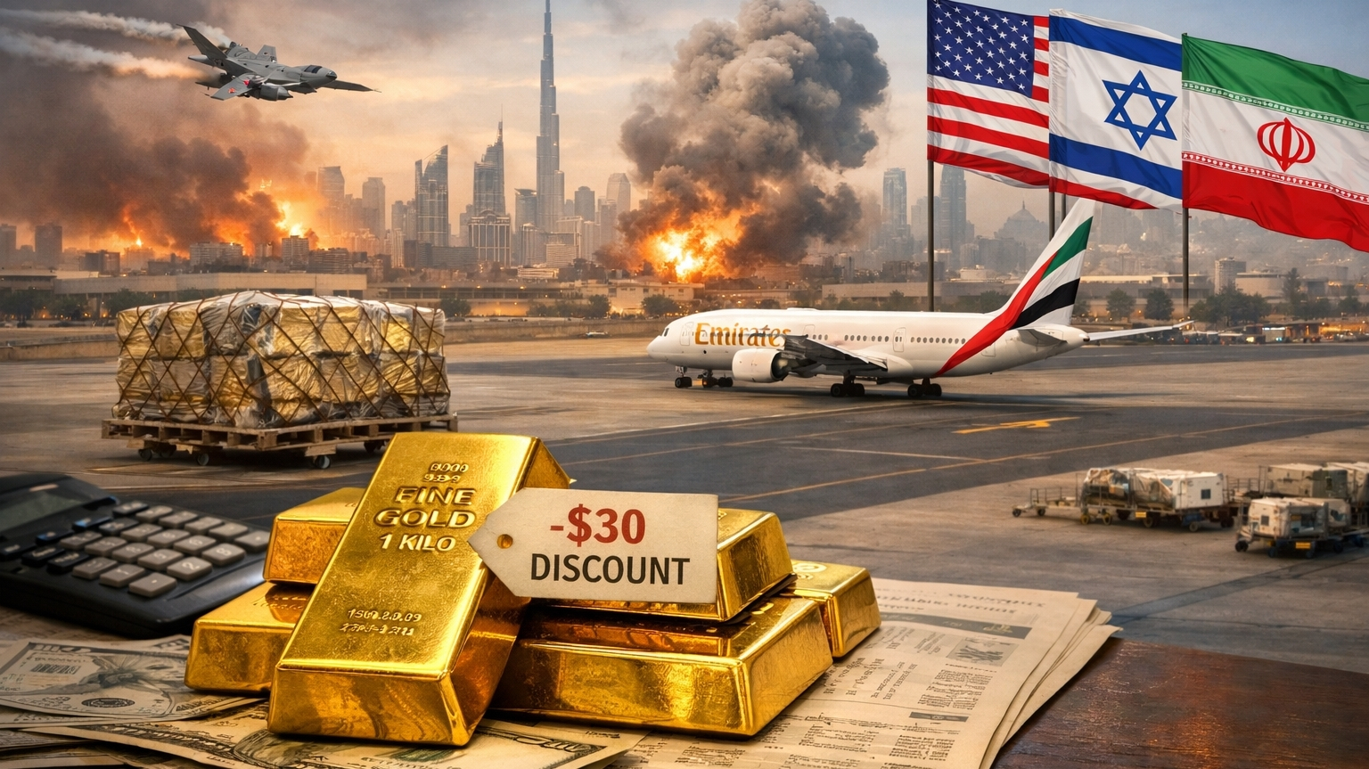 Dubai is currently selling gold at significant discounts due to disruptions caused by the ongoing Middle East conflict, according to Jin10. The conflict has led to flight cancellations, hindering suppliers' ability to transport gold bars from this crucial trade hub. Many buyers have halted new orders, unwilling to pay high transportation and insurance costs without guaranteed timely delivery. Insiders report that traders are offering discounts of up to $30 per ounce below the global benchmark price in London to avoid indefinite storage and financing costs. Despite some gold being loaded onto flights departing Dubai since mid-week, a substantial amount remains stranded as of Friday.