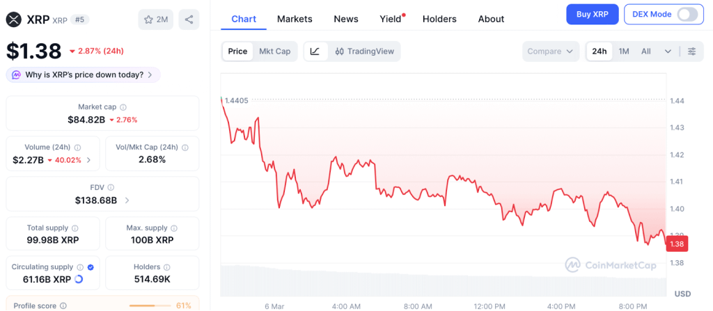 XRP si mantiene vicino a $1.38 secondo CoinMarketCap dopo aver fallito nel rompere la resistenza di $1.45 poiché le vendite ad alto volume hanno confermato una struttura ribassista. Anche se XRP recupera a $2.09, si tratta di un movimento del 50% da una base di $70 miliardi.
