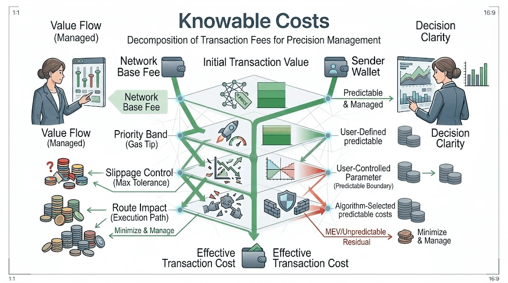 A knowable cost isn't a single number. It's a range with components. It's base fee plus priority band plus slippage model plus route analysis plus MEV exposure estimate plus explicit error bound that widens when conditions are uncertain.