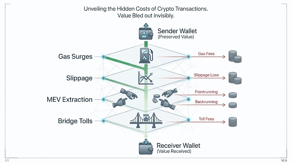 MEV is the invisible layer. The tax you don't see because it's not in any interface, not disclosed by any protocol, not visible in any transaction preview. Your swap gets sandwiched. Your liquidation gets frontrun. Your order gets reordered. Value transfers from you to bots who did nothing but watch you coming and position themselves between you and your execution.