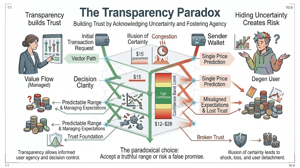 A forecast that says "between $12 and $28, with 90% confidence, widening to $45 under extreme congestion" is infinitely more valuable than an estimate that says "$14" and delivers $63. The first gives me agency. The second gives me a surprise I'll remember the next time I consider using this ecosystem.