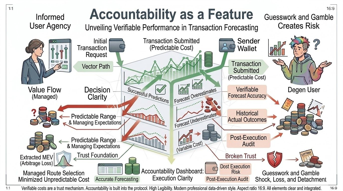 Every team can publish a fee estimator. Very few will publish the accuracy of that estimator over time. The percentage of transactions that landed within forecast range. Segmented by network conditions. Segmented by transaction type. Segmented by market volatility. The misses alongside the hits. The overestimates and underestimates and the reasons for both.