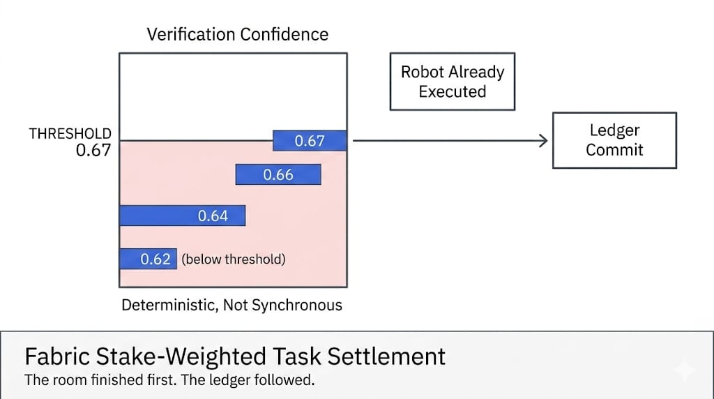The trace had already written three execution packets by then. Motion logs, sensor readback, completion flag. The robot had finished the last action cycle before the Fabric's PoRW execution verification quorum even had enough nodes online to begin.